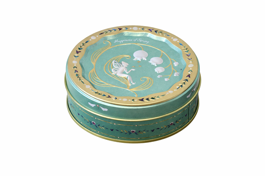 すずらんのお花と妖精があしらわれた小物缶に入ってお届け